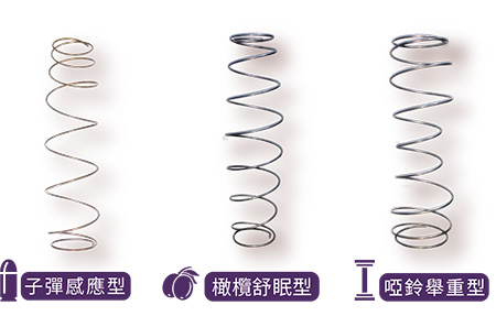 ↑ 針 對 不 同 族 群 年 齡 層 量 身 訂 做 的 三 種 彈 簧 ↑